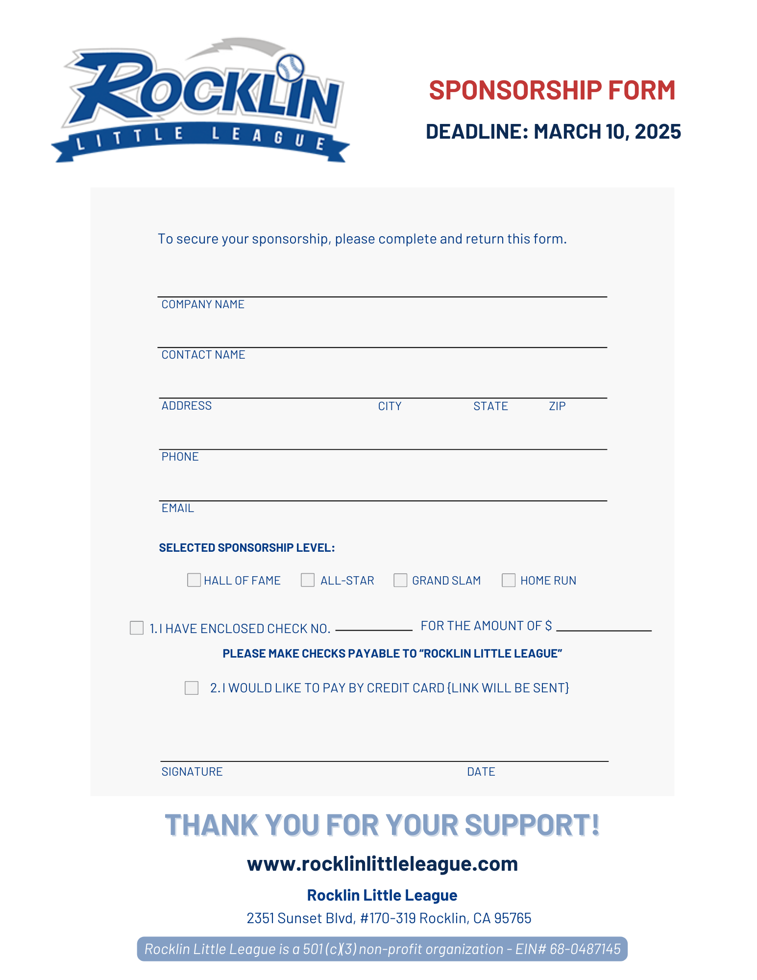 Thank you for considering a community partnership with Rocklin Little League! We look forward to hearing from you soon.